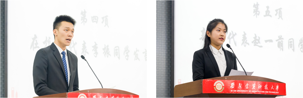 在校生代表建环1803班李振与新生代表智能2002班赵一萌先后上台发言。李振同学分享了四点大学感悟:与人为善,学会成长;确定目标,坚持学习;培养能力,锻炼自我;摆正位置,与时俱进。赵一萌同学号召20级新生弘扬建大自强、笃实、求源、创新的优良校训,在未来的大学生活中脚踏实地,珍惜青春时光,砥砺前行。
