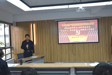 首先,学院副书记袁庆华传达了学校党委文件精神与部署要求,对学院党委“不忘初心,牢记使命”主题教育方案进行了详细解读。根据学校、学院党委安排,学院全体党员从2019年9月开始到11月底,参加主题教育活动,要将主题教育同落实学校和学院中心工作结合起来,把学习教育、调查研究、检视问题、整改落实贯穿主题教育始终,坚持学做结合,查改贯通,以学促改,以查促改,提升主题教育的质量和效果。