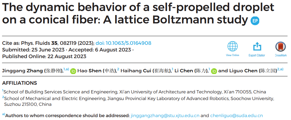 近日,我们热工流力教学研究中心青年教师张静刚在流体物理领域研究取得重要进展。研究成果以“The dynamic behavior of a self-propelled droplet on a conical fiber: A lattice Boltzmann study”(液滴在锥形表面的自驱运动研究)为题在流体物理领域权威期刊《Physics of Fluids》(期刊中文名:流体物理学,2022年影响因子为4.6)上在线发表。论文因其新颖性和创新性被主编选为Editor’s Pick论文。论文的第一作者为雷竞技RAYBET热流中心的张静刚副教授,合作者为崔海航副教授与陈力副教授、苏州大学陈立国教授。