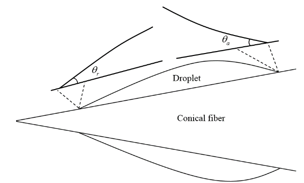 为探索液滴在锥形表面自发输运机理,本文首先将格子玻尔兹曼颜色模型拓展到变密度比系统,并通过“预估-矫正”方法实施接触角,发展了适用于复杂几何结构的非等密度比两相流动模型。随后,基于该模型并从移动接触线的角度合理地解释了液滴在锥形表面自发输运机理,即表观前进和后退接触角分别大于和小于施加的接触角,为使表观前进和后退接触角与施加的接触角相等,前进和后退接触线均会向基底运动(见图2)。