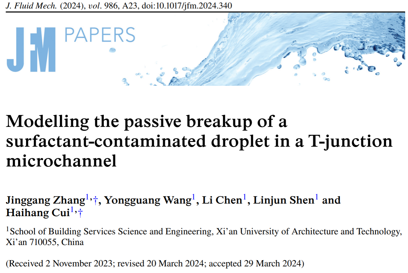 近日,我们张静刚副教授在流体力学领域研究取得重要进展。研究成果以“Modelling the passive breakup of a surfactant-contaminated droplet in a T-junction microchannel(T型微通道内含表面活性剂液滴破裂的数值研究)”为题在《Journal of Fluid Mechanics》(流体力学杂志,2023年影响因子为3.7)上在线发表。论文第一作者为学院热工流力中心张静刚副教授,第二作者为研究生王永光,合作作者为崔海航副教授、陈力副教授。《Journalof Fluid Mechanics》期刊由英国剑桥大学创办,被公认为流体力学领域最权威的期刊。这是我校首次作为第一署名单位在该期刊上发表论文,相关工作受到国家自然科学基金青年基金项目的资助。