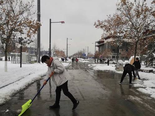 此项扫雪除冰行动长达两小时。青年志愿者服务队的同学们全身心的投入到扫雪防冻“攻坚战”中,他们不畏严寒,积极扫雪,虽然疲惫写满了粗糙的脸庞,汗水和雪水浸湿了全身,但是他们仍然用实际行动展示建科学子踏实、务实的本色,把责任落实到了实处,为创造一个更加和谐美好的校园贡献了自己的力量。