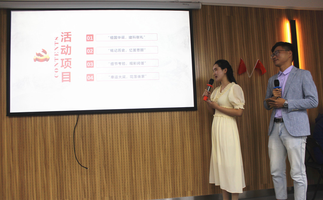活动伊始,主持人介绍了本次活动的具体内容:分为“祖国华诞,建科献礼”、“铭记历史,忆苦思甜”、“细节考验,观影问答”、“幸运大奖,花落谁家”四个环节。活动第一枪在“你的笑容我来守护”的视频播放中被打响,视频里每一张笑脸,每一声祝福,都承载着建科学子对祖国深切的爱意,展现了全体建科学子团结一致的精神面貌。
