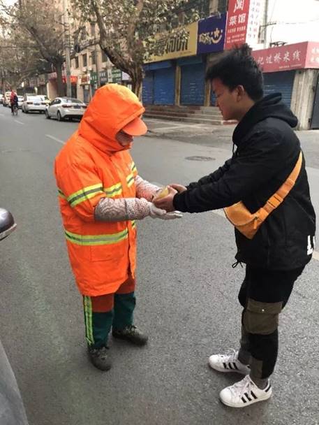 环卫工人伴着月色已经开始了辛勤的工作,此时,建环四班部分同学也已分为十个小组,寻找在这座城市忙碌的身影,准备为他们送出热腾腾的爱心早餐,并帮助环卫工人清扫路面。在交谈过程中,同学们了解到在寂静的大街上还未有行人的身影时,环卫工人早已拿着簸箕奔走在城市的大街小巷。早餐对他们而言,也仿佛只是一顿加餐,当温暖的早餐被递到他们手上时,同学们看到他们皲裂的手紧紧握着早饭,也正是他们纯朴的笑温暖着我们,更温暖着城市里所有的人。他们桔红色的工作服在路灯的辉映下,闪烁出点点的光芒。